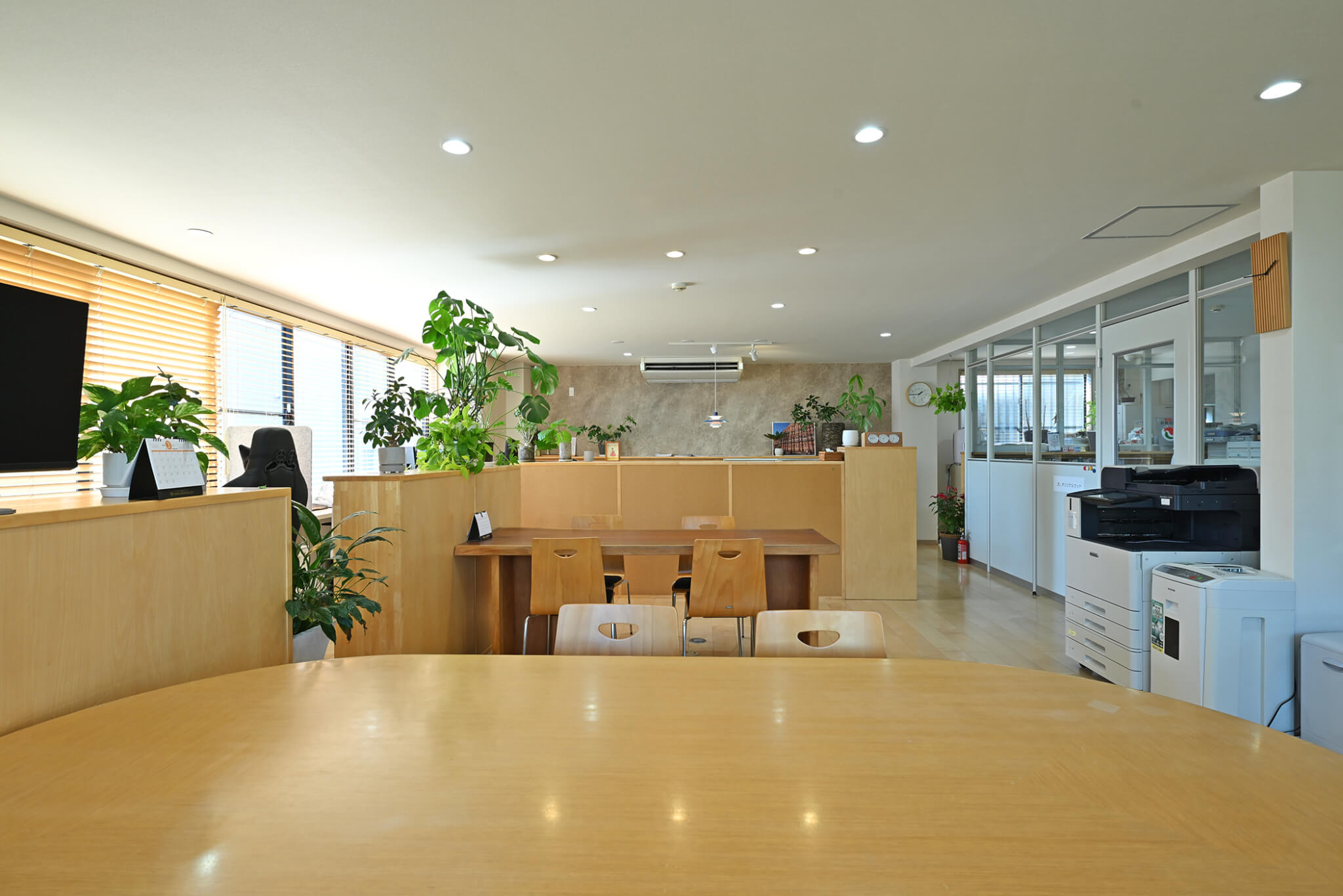 テーブル・カウンター家具、ブラインドなどで木質感が高くなっているのがわかります。