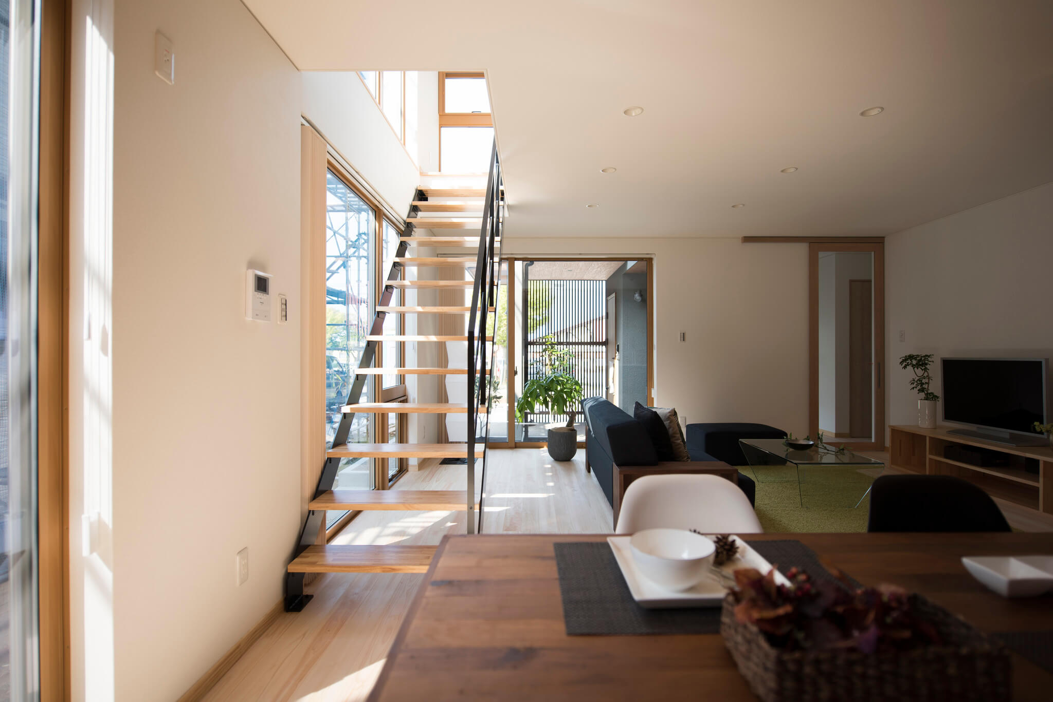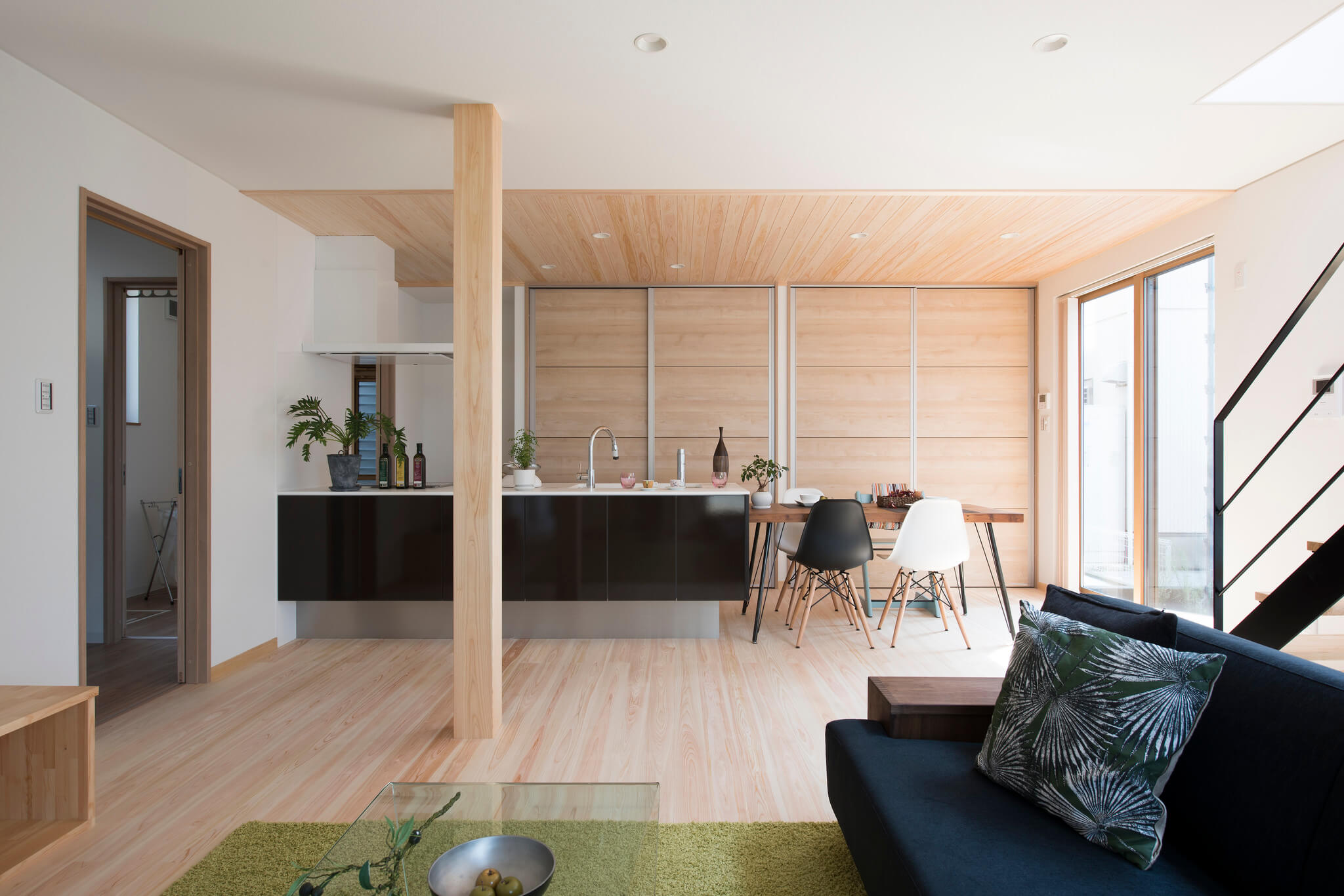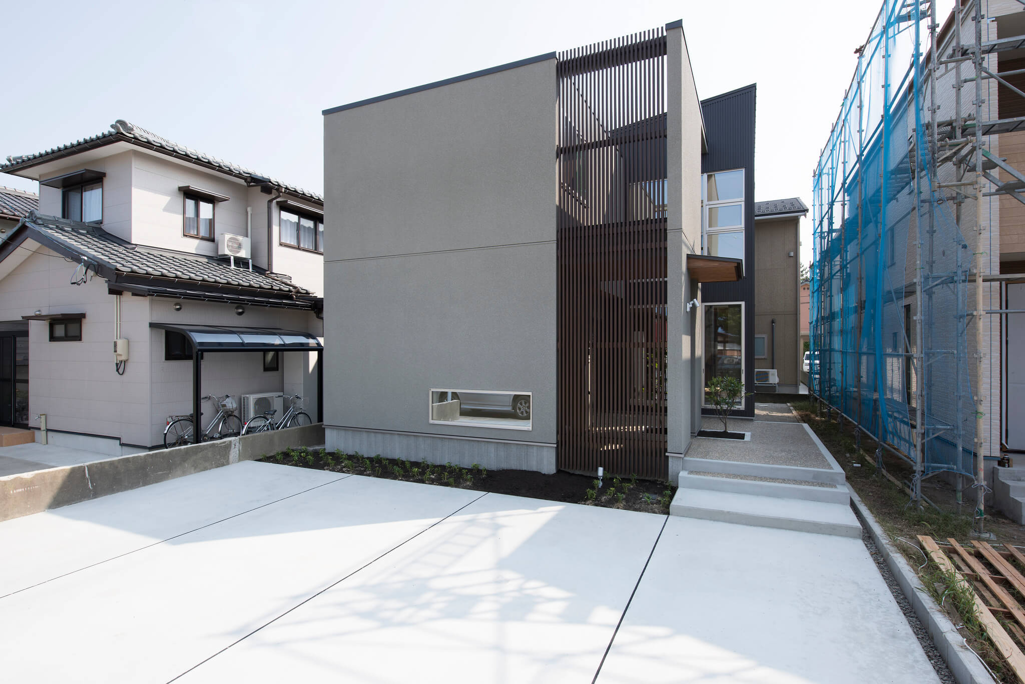 モダンな外観は街並みに調和する素材と色使いを意識しました。 室内は木の温もりに包まれ、シンプルな間取りが開放感を生みます。 リズム感のある窓配置が洗練された印象を演出します。