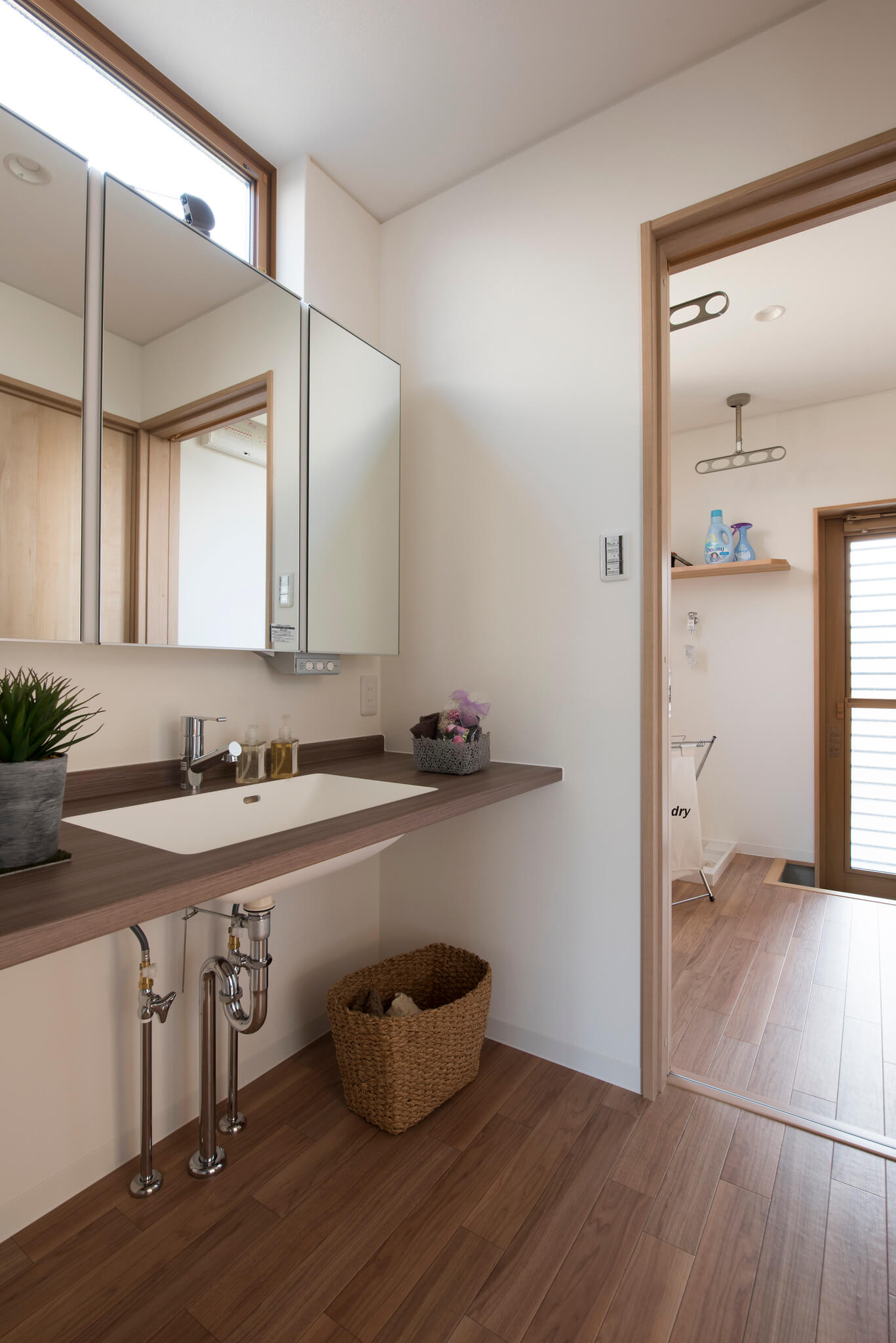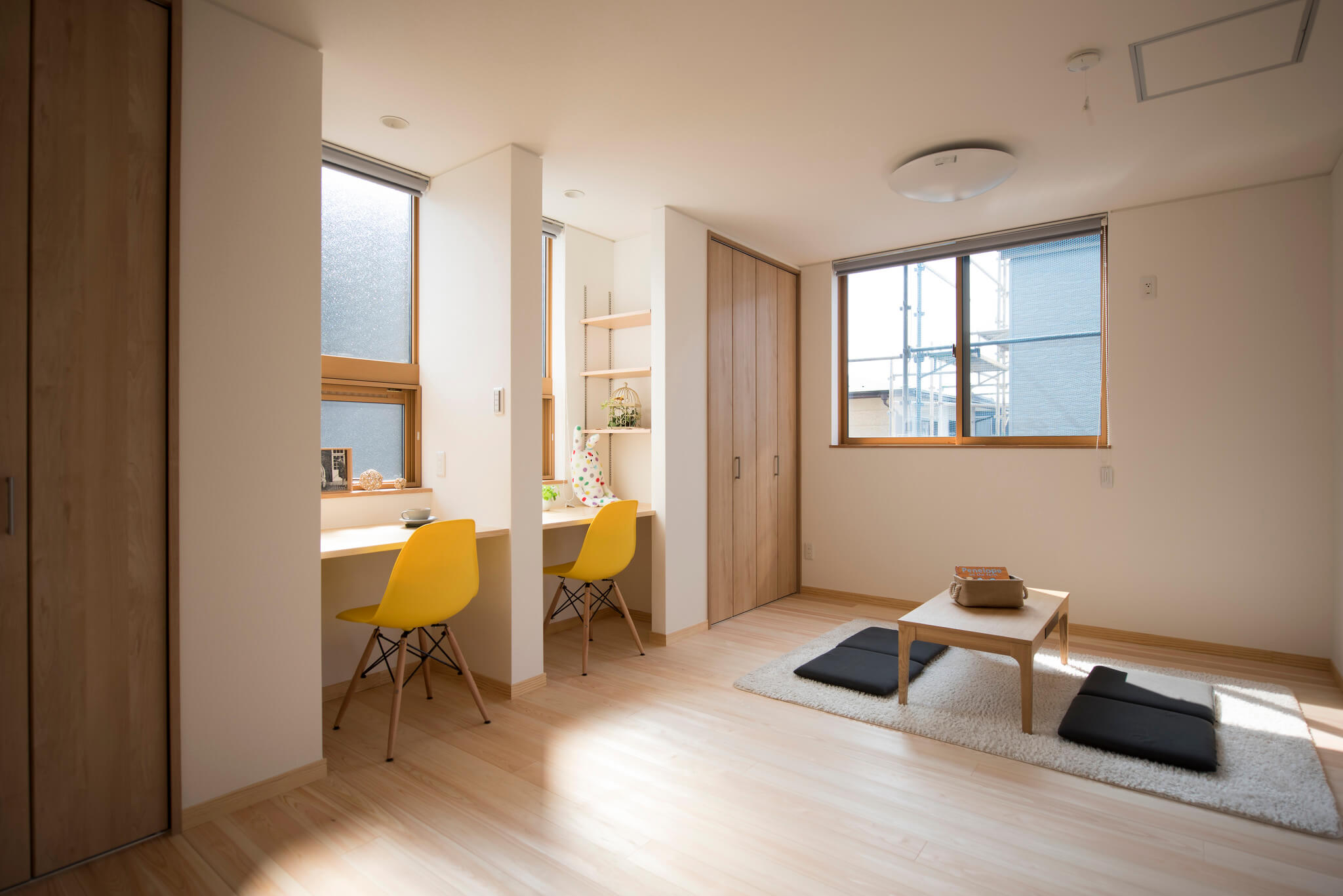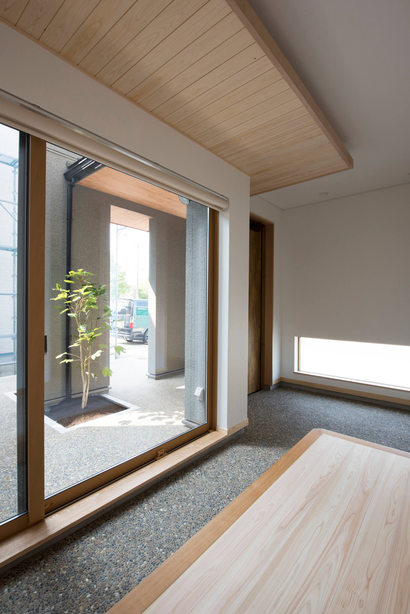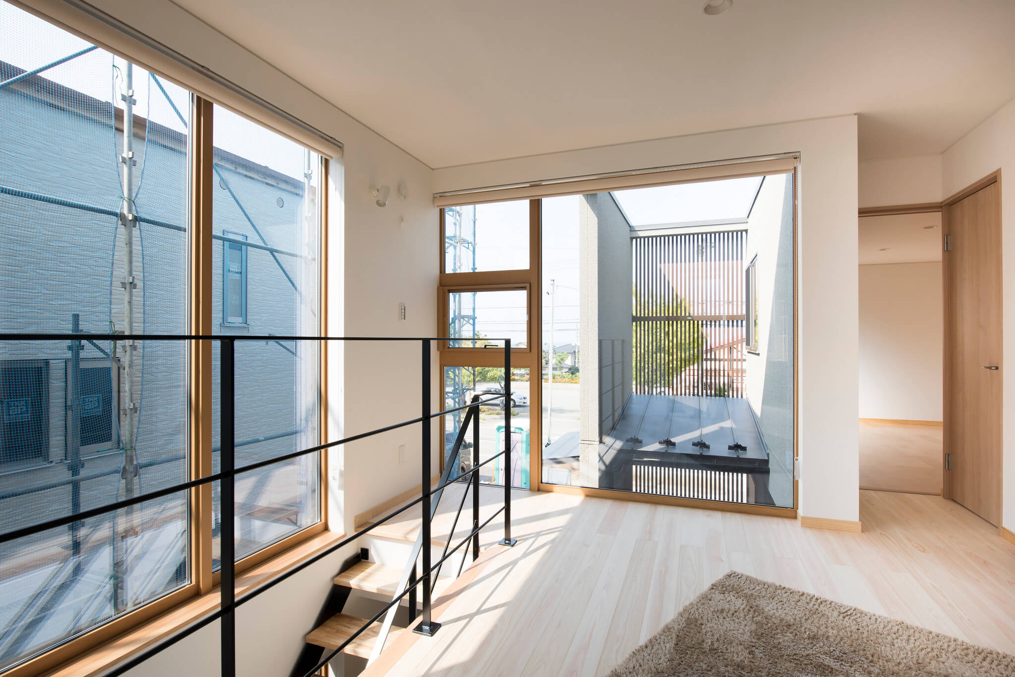 モダンな外観は街並みに調和する素材と色使いを意識しました。 室内は木の温もりに包まれ、シンプルな間取りが開放感を生みます。 リズム感のある窓配置が洗練された印象を演出します。