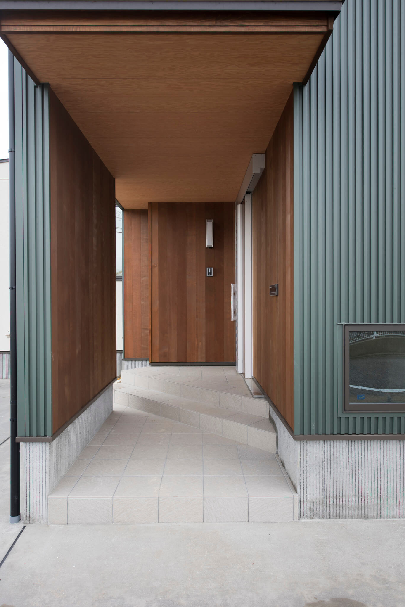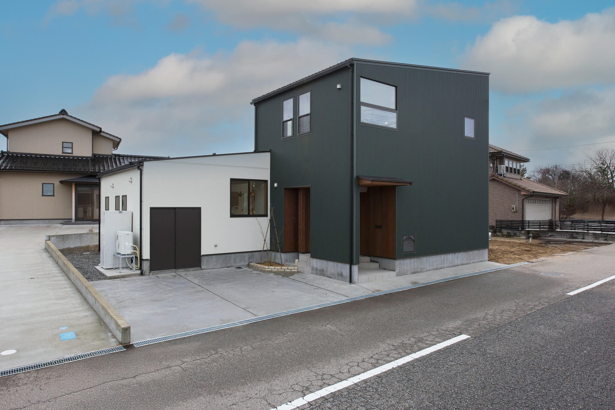 静かで環境の良いロケーションの中、深緑のガルバリウムの外壁が現代風で落ち着いた印象を与えてくれます。