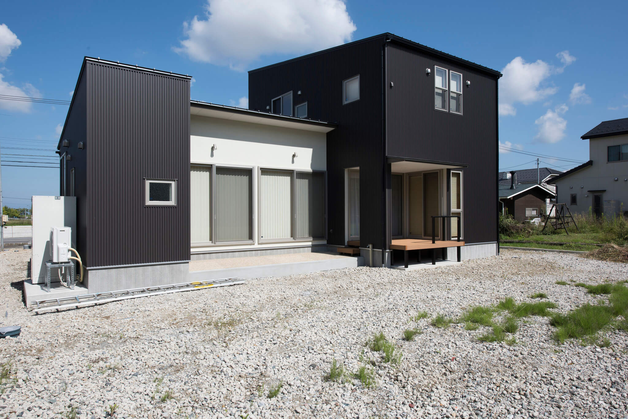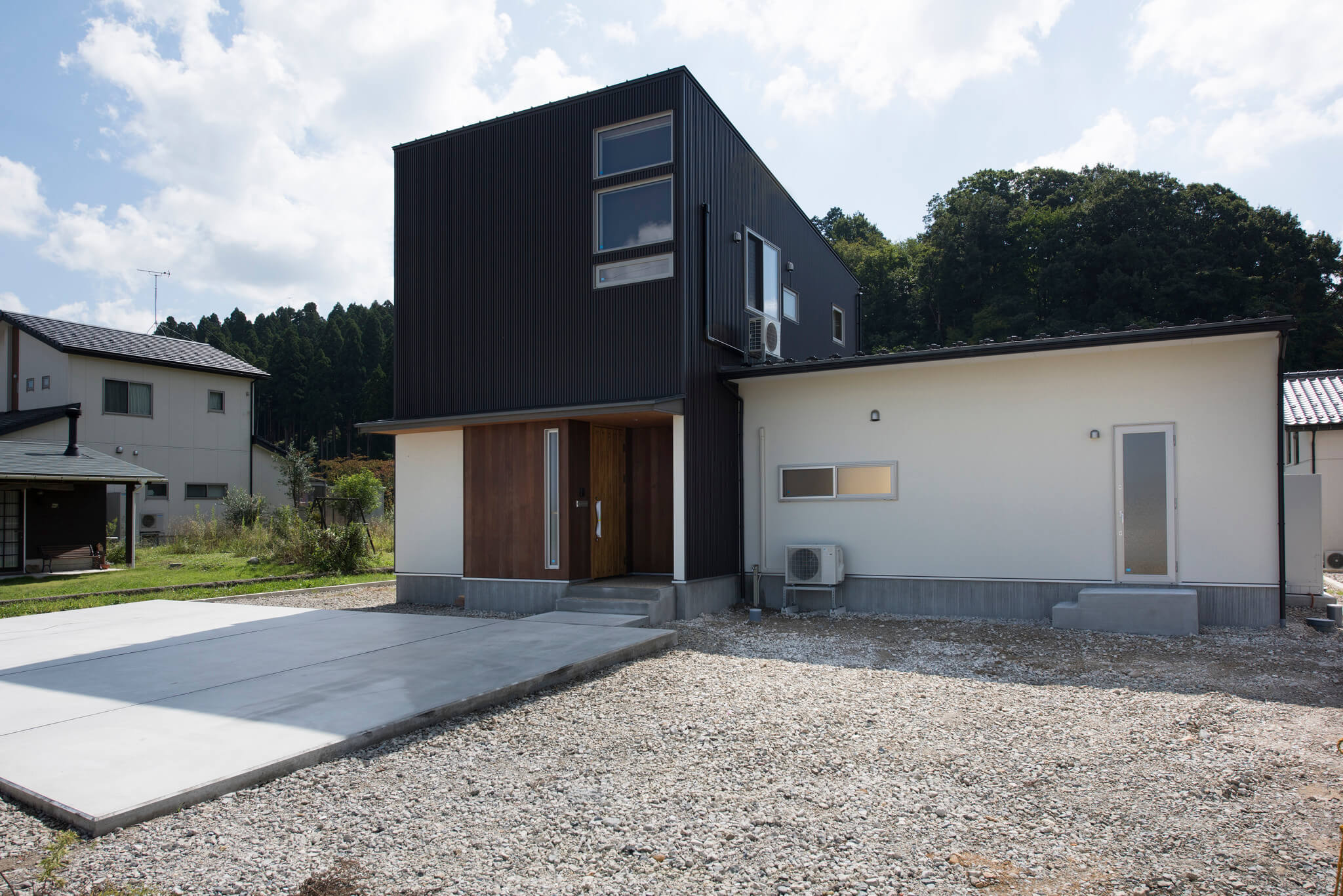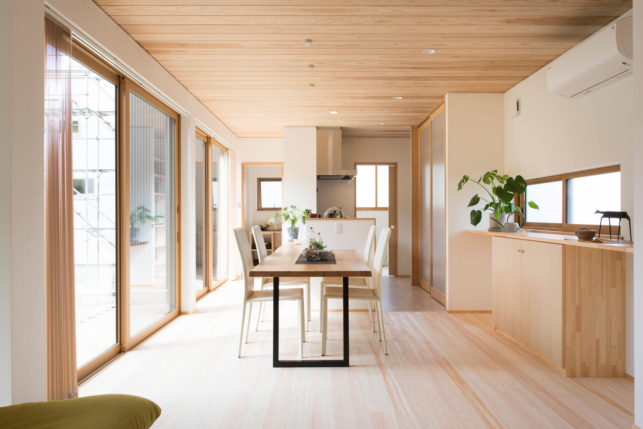 ガルバリウム×木×吹付けの外壁が映える、シンプルで飽きのこない外観。総二階と平屋を組み合わせた構成で、意匠性と構造安定性を両立しています。東濃ヒノキ無垢フローリングは節のない美しい木目と芳香が魅力です。