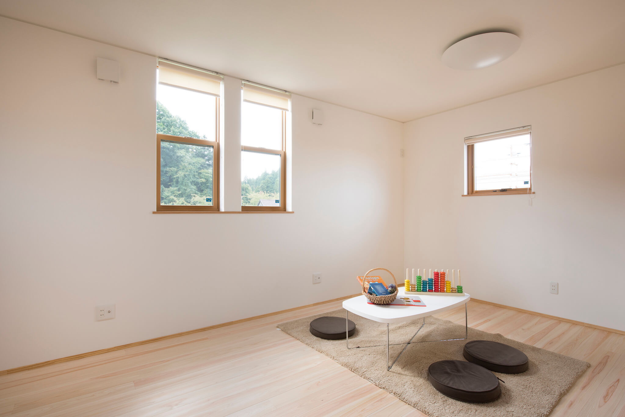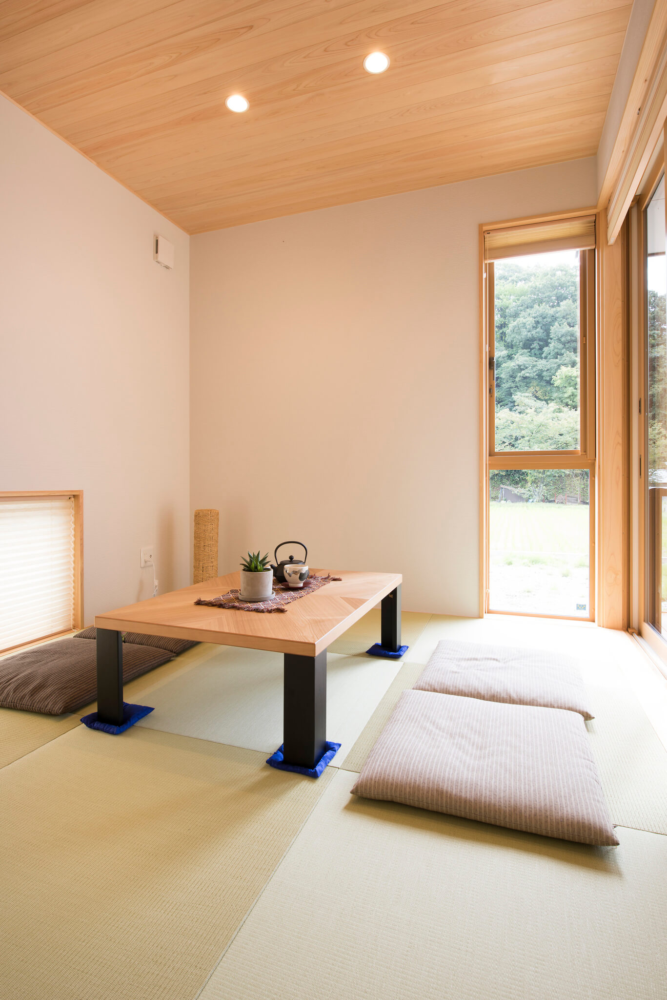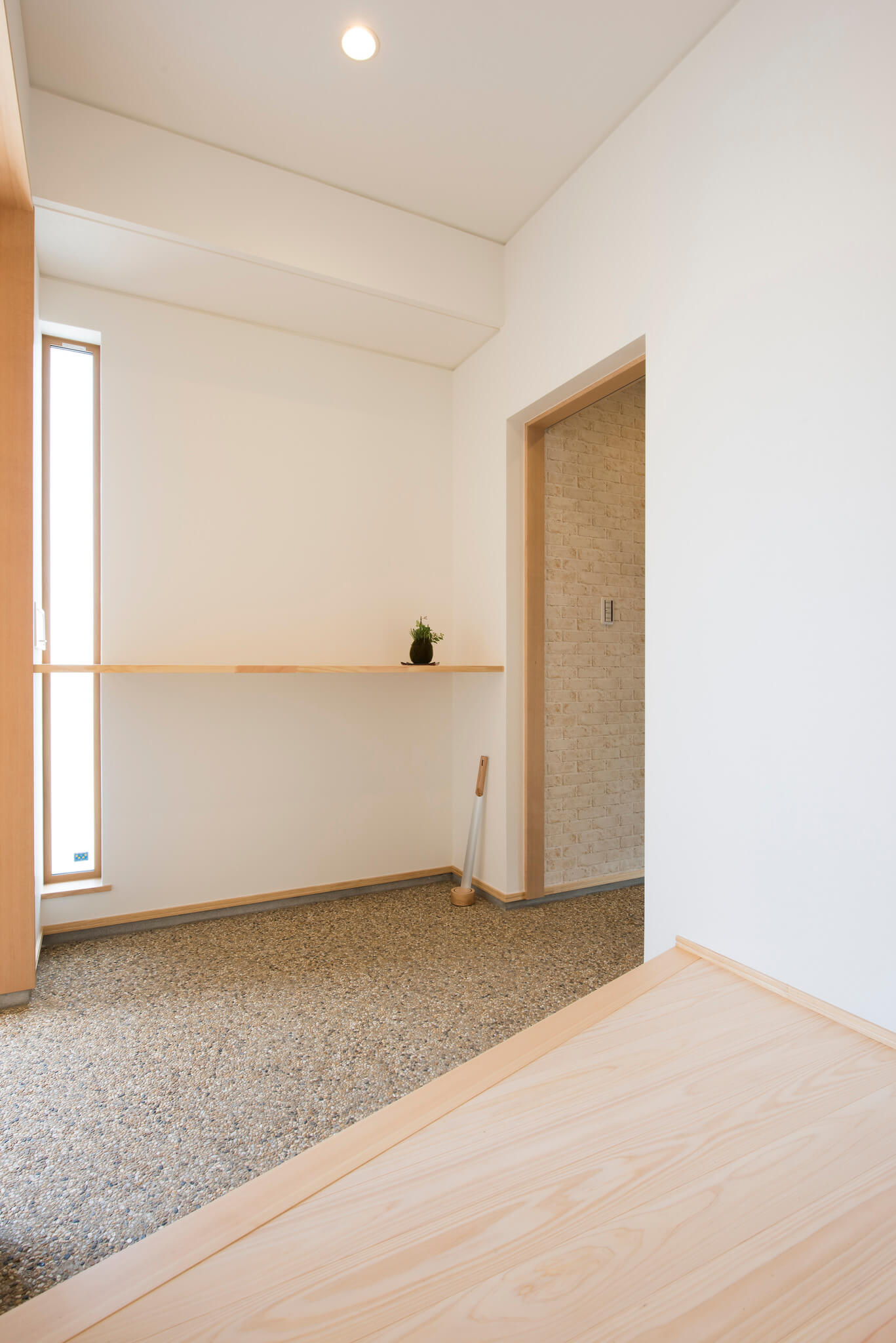 ガルバリウム×木×吹付けの外壁が映える、シンプルで飽きのこない外観。総二階と平屋を組み合わせた構成で、意匠性と構造安定性を両立しています。東濃ヒノキ無垢フローリングは節のない美しい木目と芳香が魅力です。
