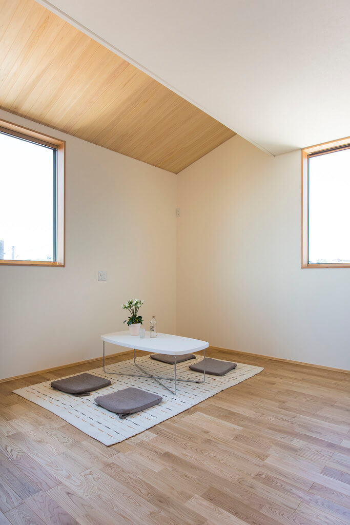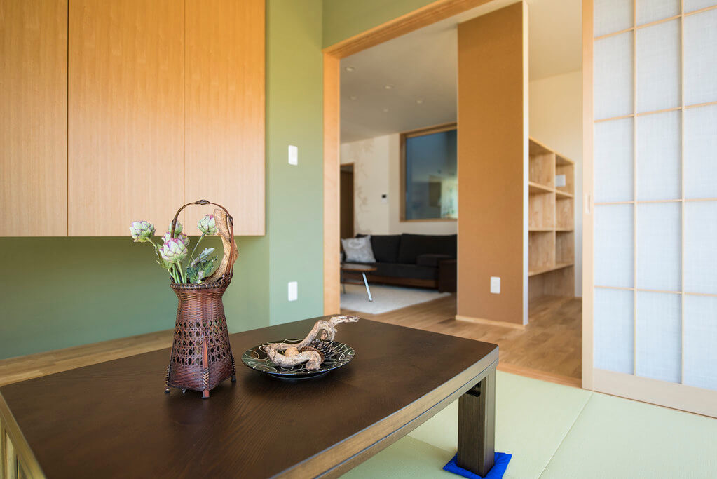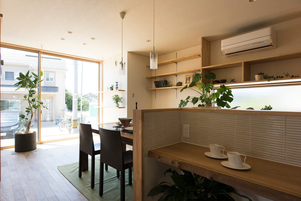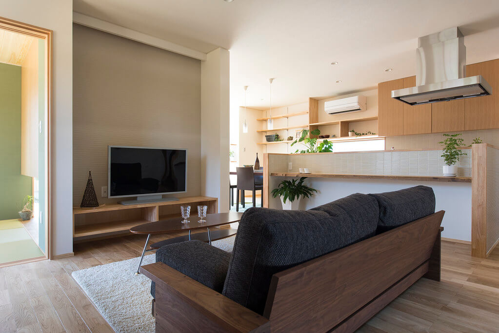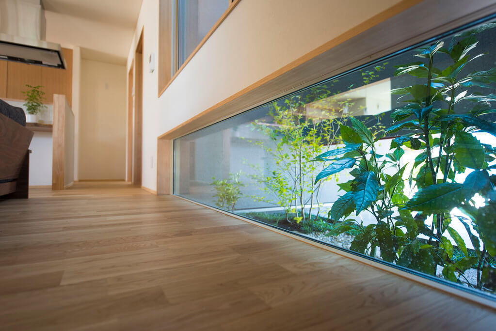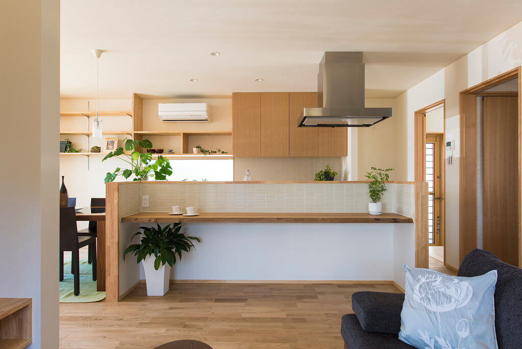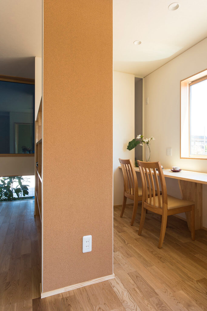 キッチンを中心にリビング/学習スペース/和室が配置され、動線を兼ねることで空間に広がりを感じます。リビングから見える前庭の植栽は空間に彩りと安らぎを与えてくれます。